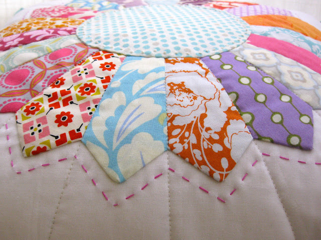 I LOVED how this practice, missing-petal-ed Dresden turned out, so I made it into a quilted pillow, stitching it to an 18.5-inch kona snow background, complete with a batting layer for squishyness, straight quilting lines radiating out from the center, some hand-stitched details, and a solid kona aqua binding.