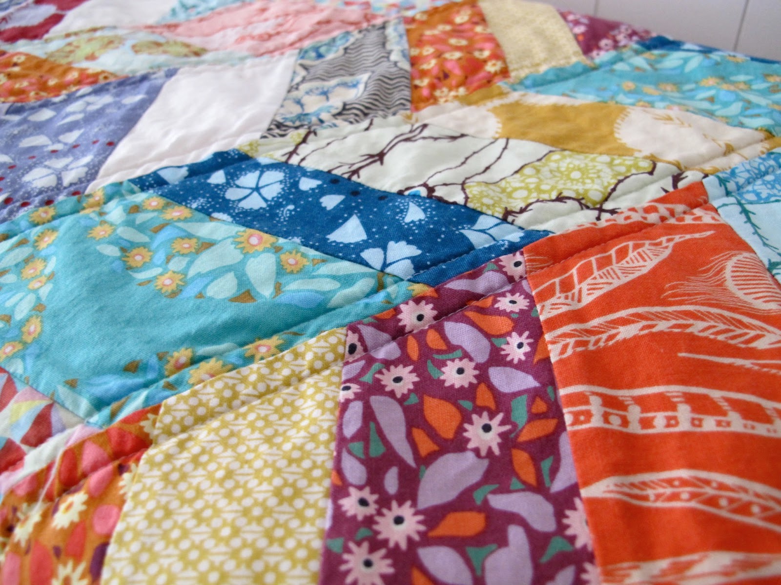 I used a strip piecing technique (as illustrated in this tutorial), but varied strip width and made units of about three fabrics so that I could mix them all up for a random look.